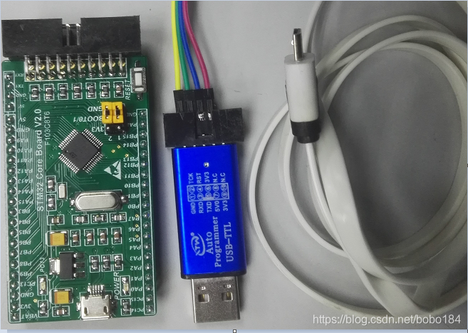 然后使用USB转串口线连接开发板和电脑USB,其中串口线的TX RX分布连接开发板PA10 PA9,然后将BOOT0短接3.3V BOOT1短接GND进入烧写状态,串口线的VCC GND分布连接开发板的5V 即可无需另外供电。