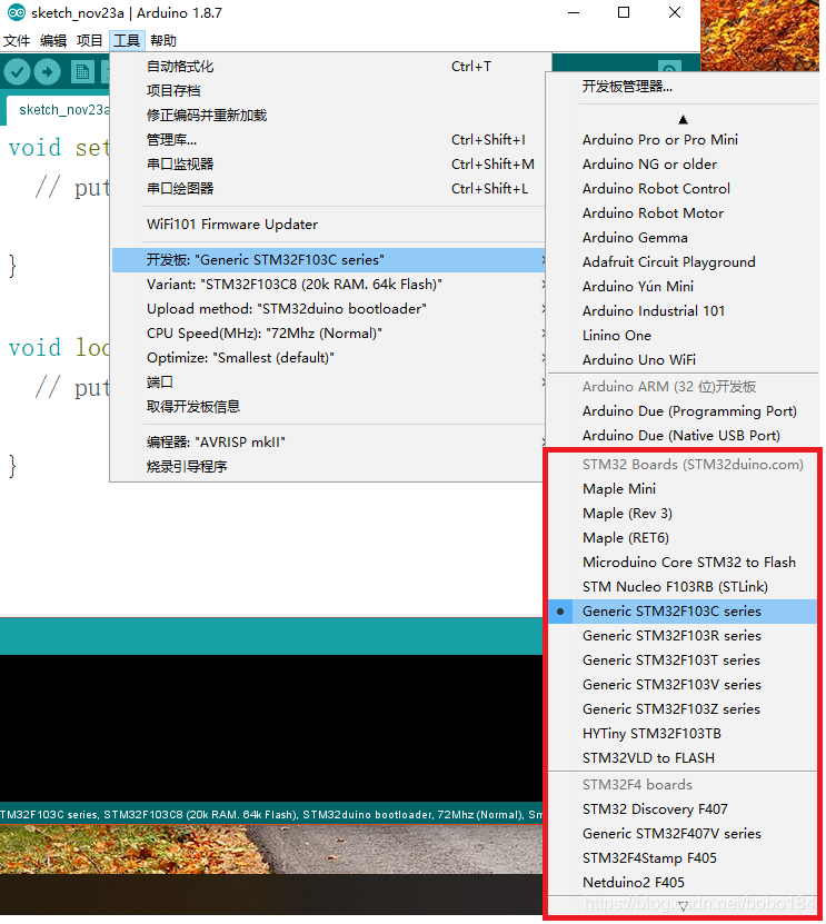 现在你就可以在工具-开发板里找到STM32系列的板子了
